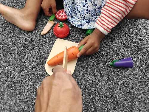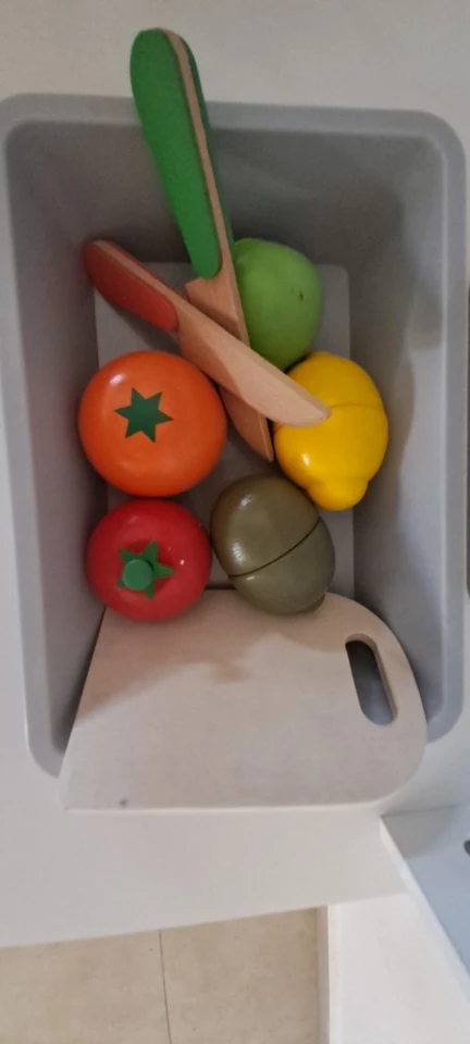 The included wooden knife and cutting board make the experience feel realistic while supporting fine motor skills, hand–eye coordination, and early learning. Perfect for toddlers and young children, this durable set adds fun, creativity, and learning to any play kitchen.