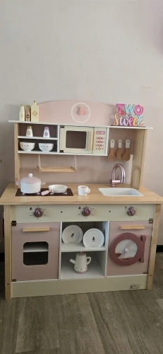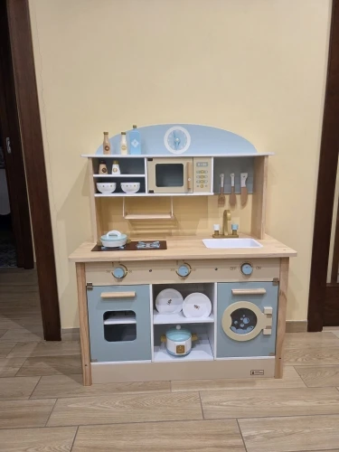 Inspire endless imaginative play with our wooden play kitchen playset, beautifully crafted to look and feel like a real kitchen. Featuring a cooker, sink, oven, microwave, and washing machine, this detailed set invites little chefs to cook, clean, and create just like grown-ups.